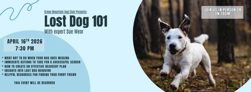 Our April program , “Lost Dog 101” with Vermont’s lost dog expert Sue Wear, will be held on Thursday, April 16, at 7:30 PM in person at the Duxbury Town Office (select board meeting room) for members, or via Zoom for the public.